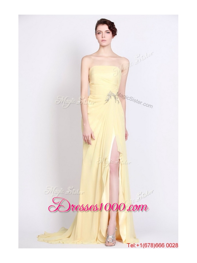 Beautiful Strapless Beaded and High Slit Prom Dresses in Yellow