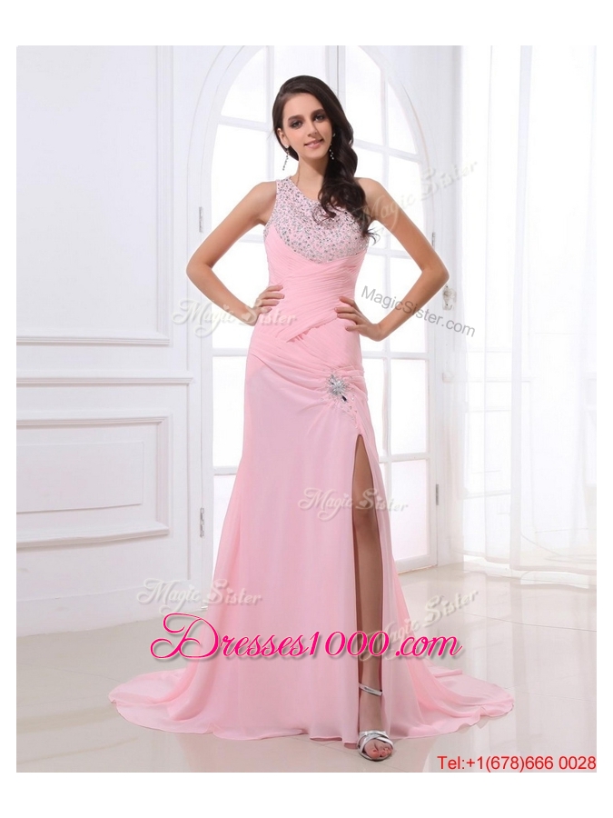 Cheap Column Brush Train Prom Dresses with High Slit and Beading