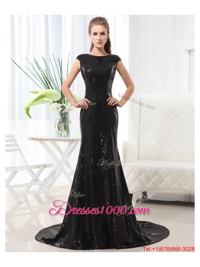 Beautiful Column Bateau Brush Train Sequins Prom Dresses in Black for 2016