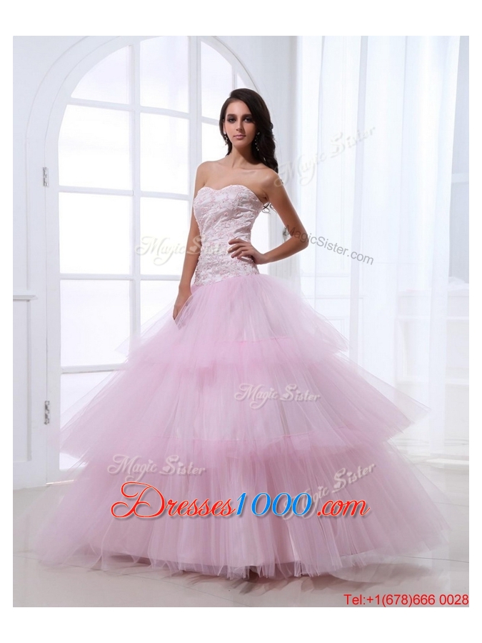 Wonderful Sweetheart Baby Pink Prom Dresses with Sequins and Ruffled Layers