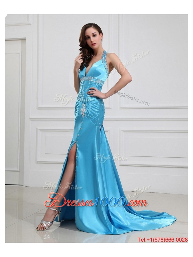 2016 Column Halter Top Brush Train Prom Dresses with High Slit