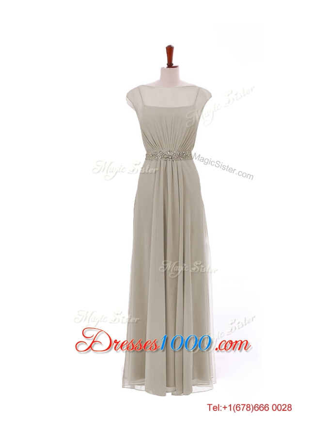 Simple Bateau Grey Long Prom Dresses with Beading and Sashes