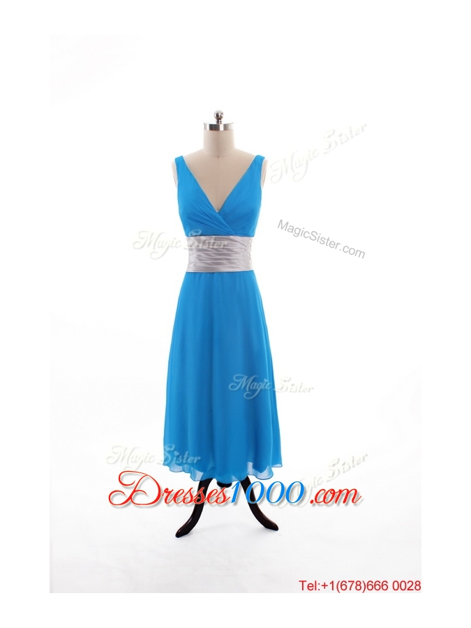 2016 Spring Empire V Neck Tea Length Prom Dresses with Belt