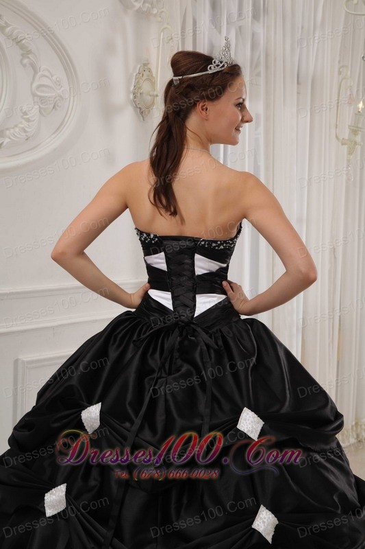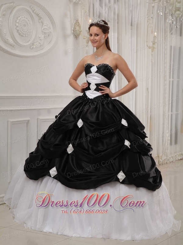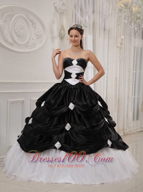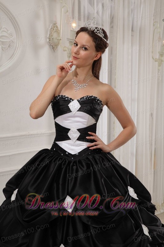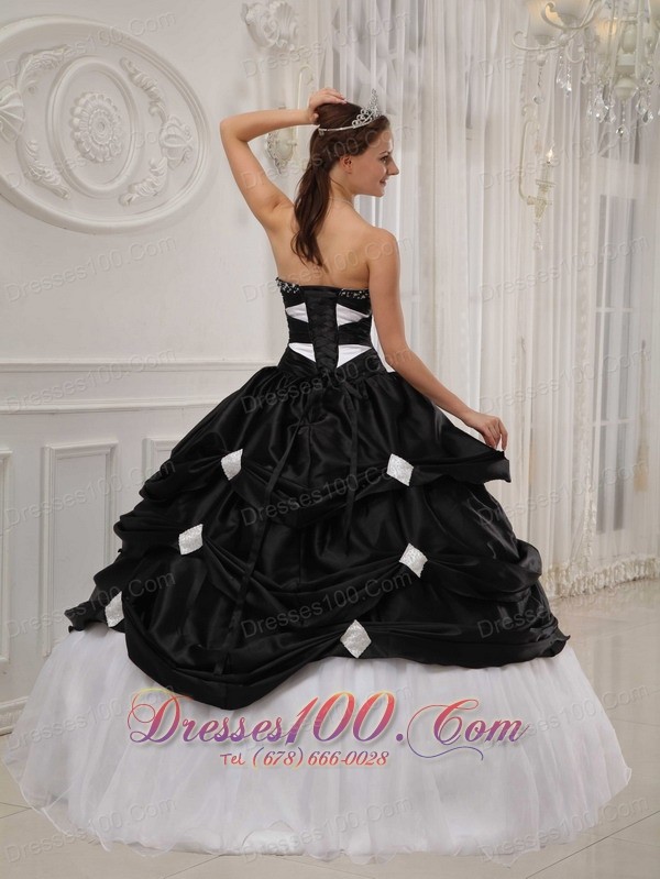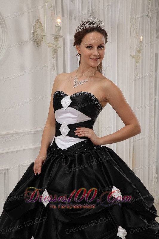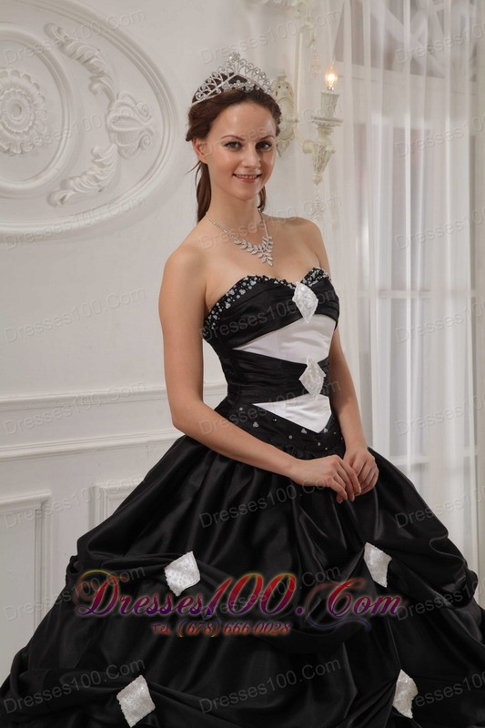 This is a gorgeous quinceanera dress. the skirt in particular. The color with white and black is classical. The bodice features a sweetheart neckline with rhinestone. The full length skirt falls from the body-hugging waist in tiers with a bustle effect. This lovely dress will make your dream come true.