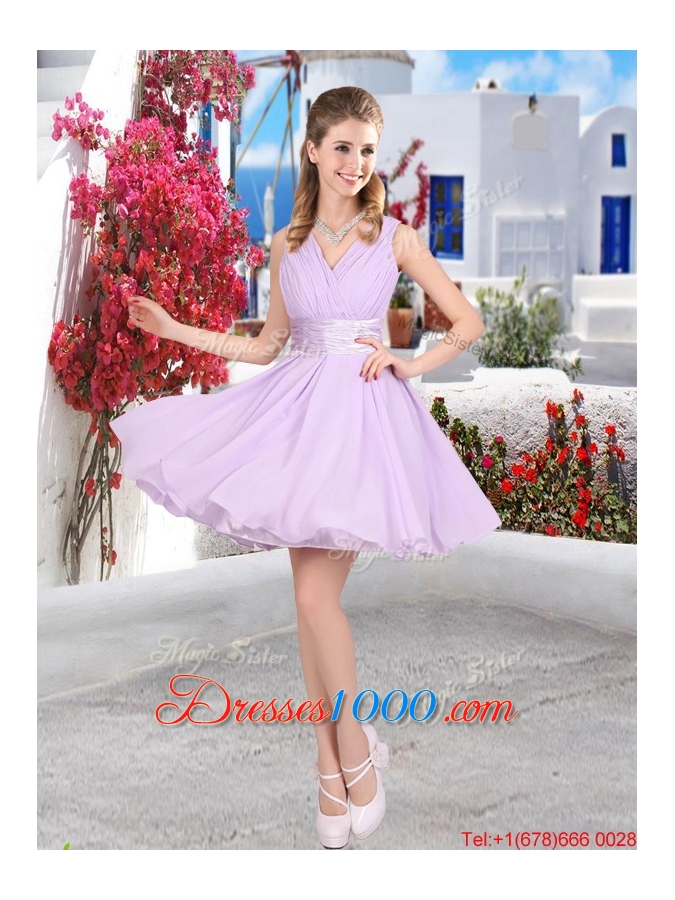 Pretty Mini Length Belt Chiffon Prom Dresses with V Neck
