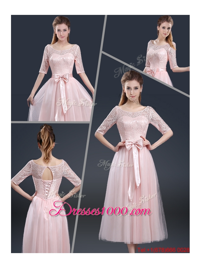 2016 Elegant Tea Length Prom Dresses with Lace and Bowknot