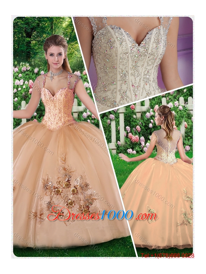 2016 New Style Straps Champange Quinceanera Dresses with Beading and Appliques