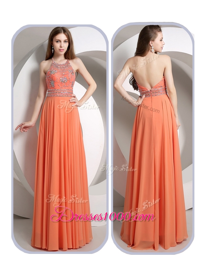 Elegant Empire Halter Top Orange Prom Dresses with Beading