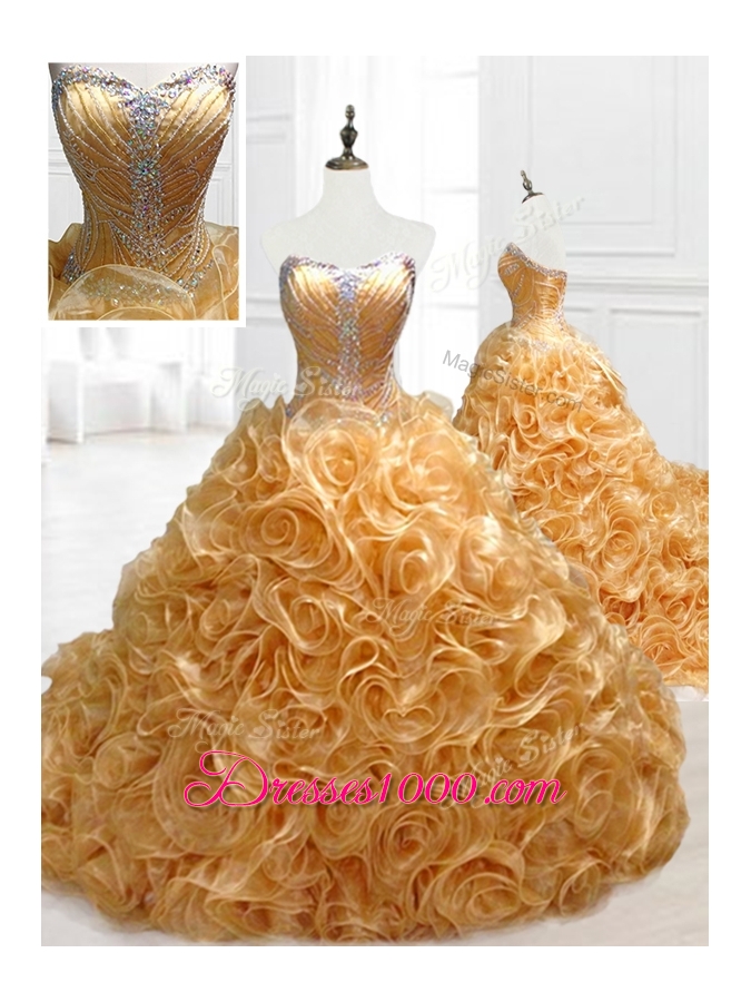Elegant Sweetheart Rolling Flowers Brush Train Quinceanera Dresses with Beading