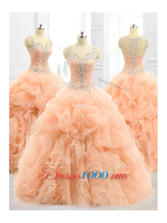 Cheap Straps Beading and Ruffles Quinceanera Dresses in Peach
