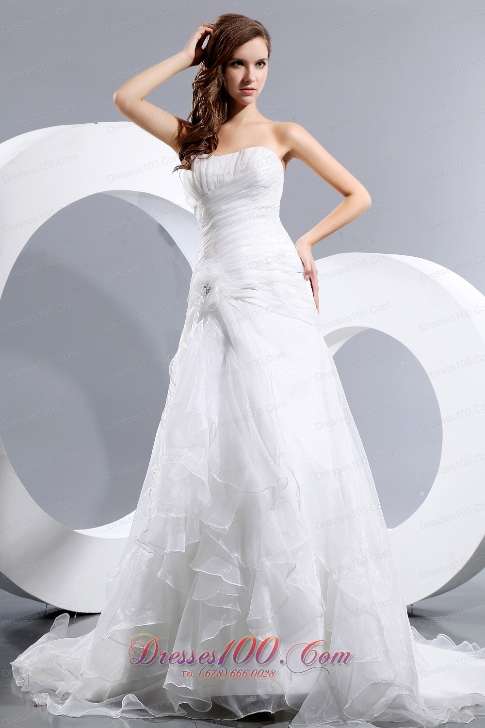 Be the belle on your wedding in this romatic and elegant princess-inspired gown. It has a lovely gathered texture on the bodice and a pleated pattern all the way to the hips. A handmade rose with beaded accents adorns the hip. The floor-length skirt is made from a series of bunches and ruffles that combine to create a beautiful silhouette when worn. A beautiful sweeping train with a ruffled hem trails behind. Zipper up back makes the dress easily on and off. Simply stunning.