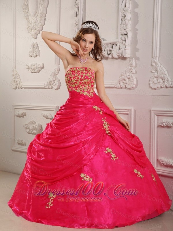 Hot Pink Strapless Appliques Ball Gown for Sweet 16 Organza