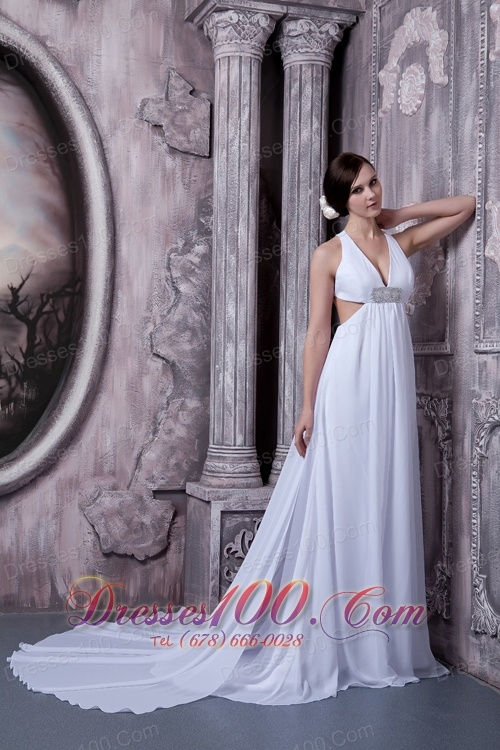 V-neck Court Train Chiffon Beading Wedding Dress