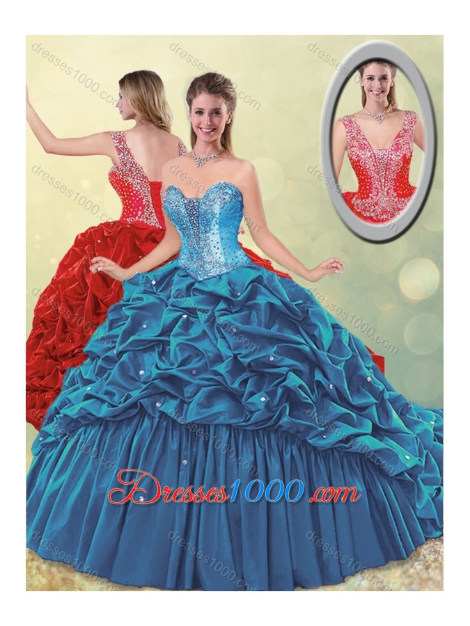 2016 Elegant Puffy Skirt Beaded Teal Quinceanera Dress with Brush Train