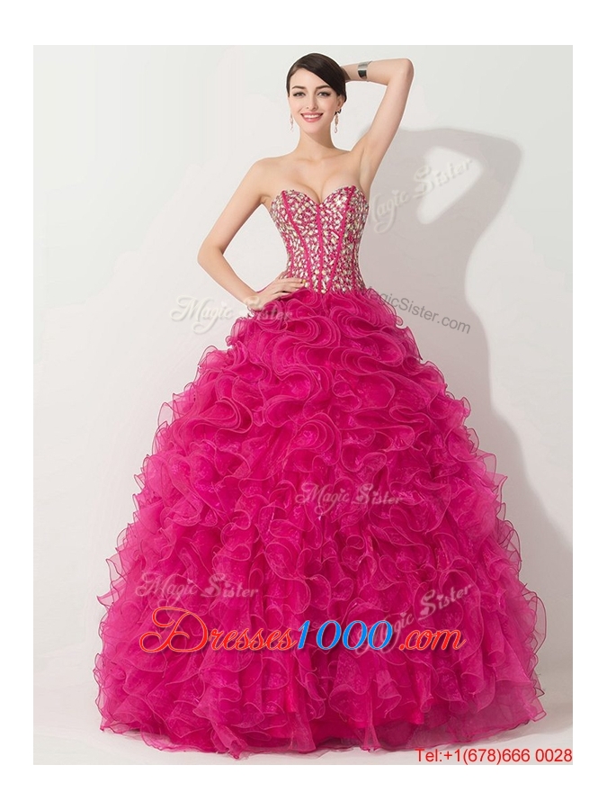 Visible Boning Hot Pink Quinceanera Gown with Beading and Ruffles