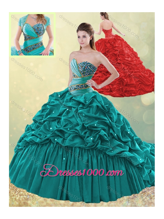 2016 Clearance Brush Train Taffeta Bubble Quinceanera Dress in Turquoise