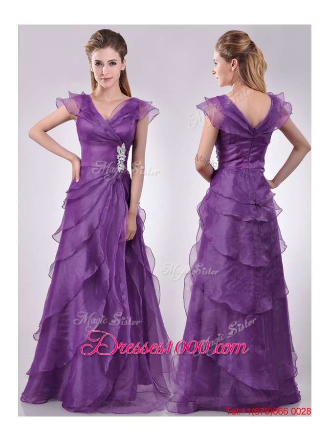 Low Price V Neck Eggplant Purple Mother of Bride Dress with Beading and Ruffles