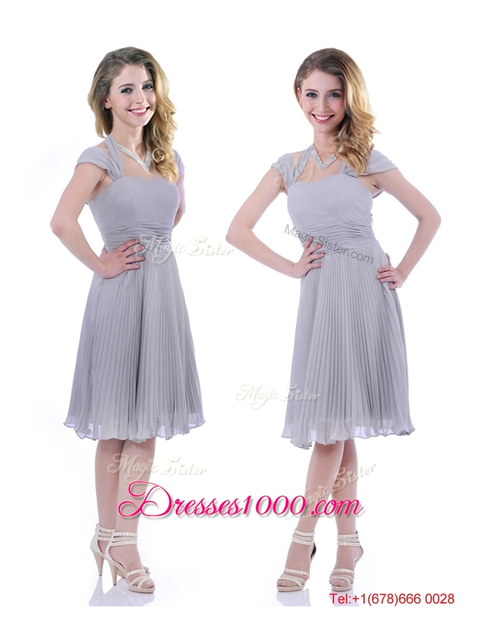 Elegant Cap Sleeves Tea Length Grey Mother of Bride Dress with Pleats