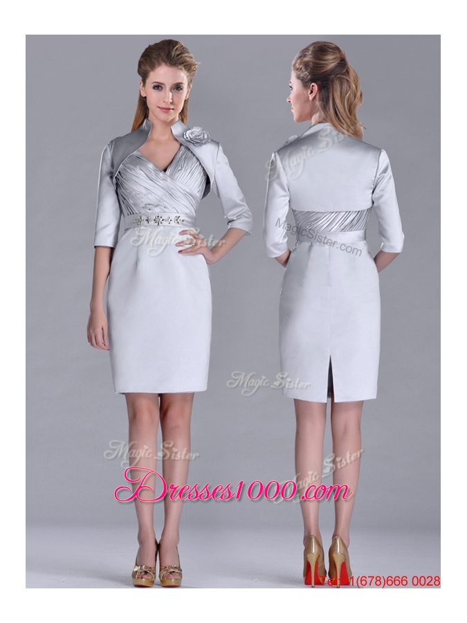 Popular Column Belted with Beading Silver Mother of Bride Dress with V Neck