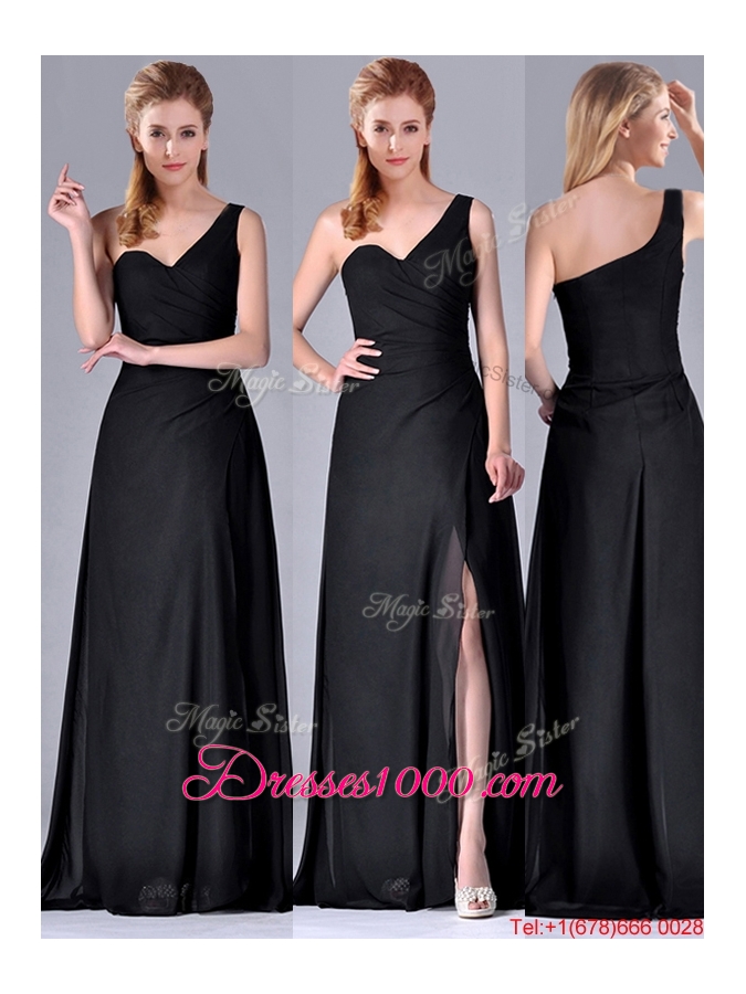 Gorgeous One Shoulder Black Mother of Bride Dress with Ruching and High Slit
