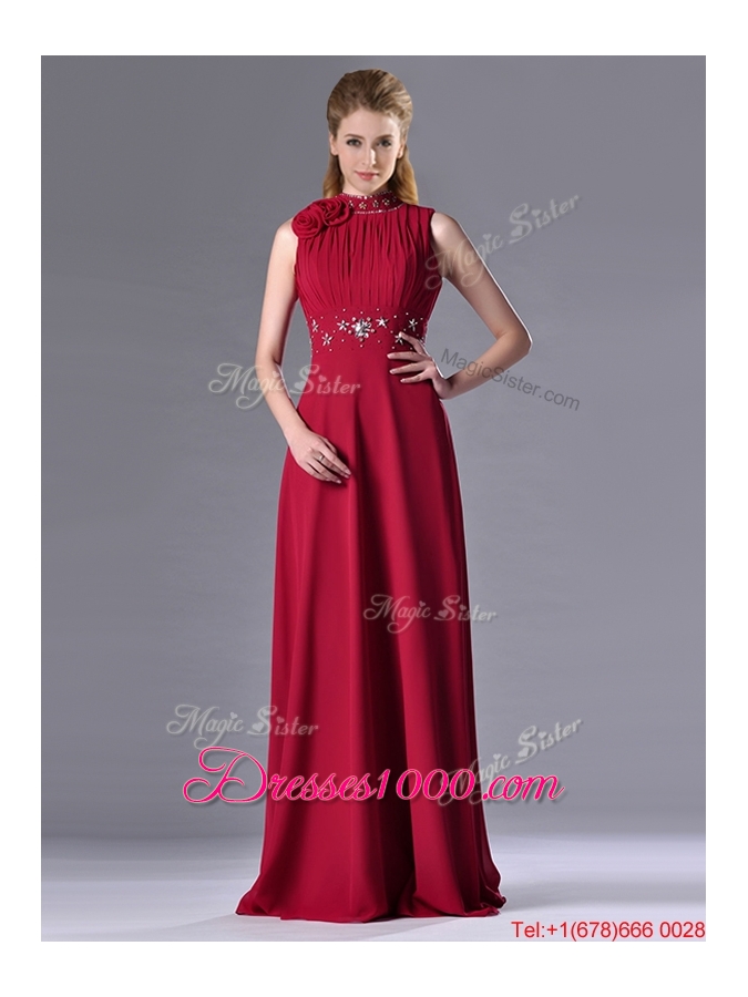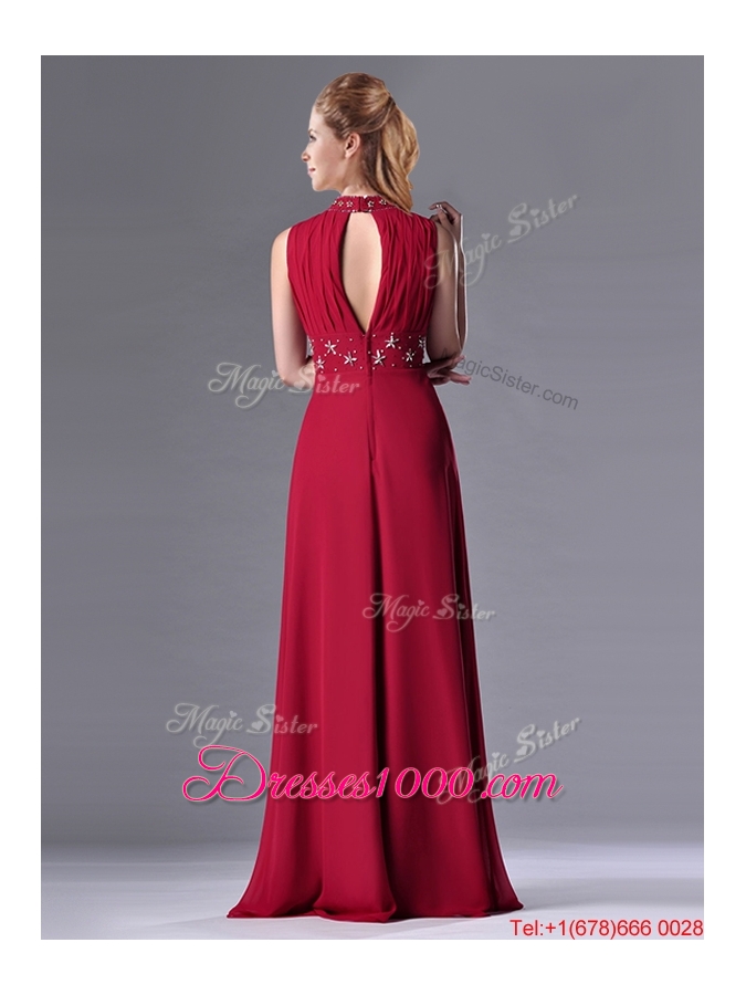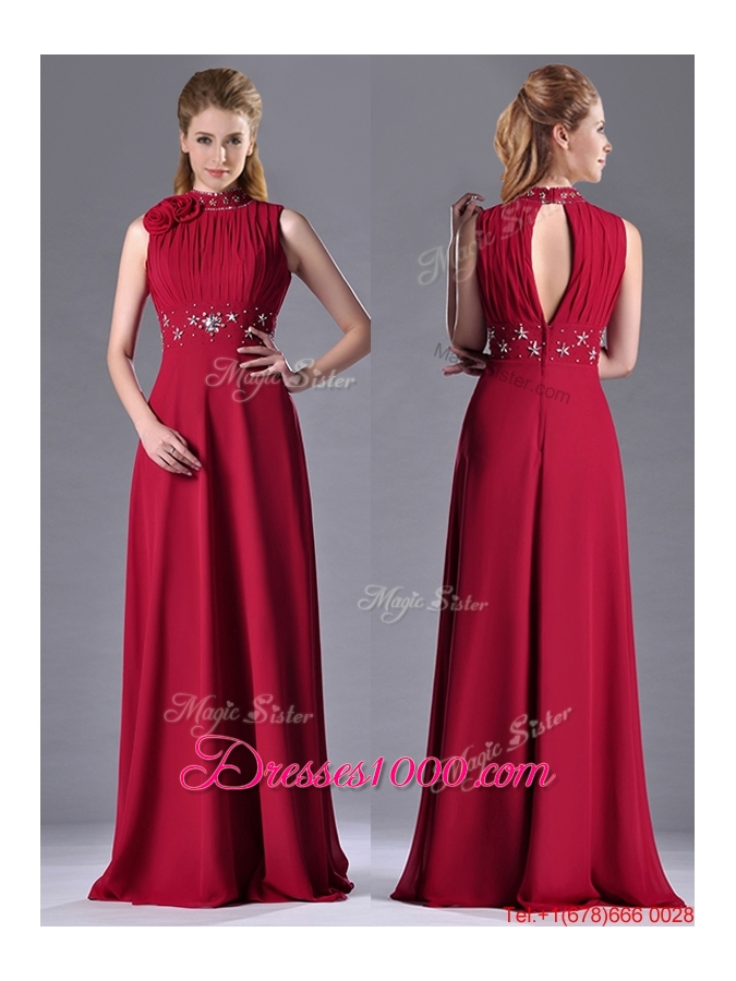 Empire High Neck Open Back Red Mother of Bride Dress with Beading and Hand Crafted