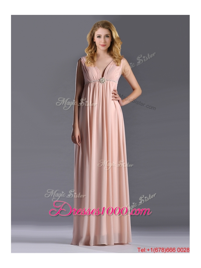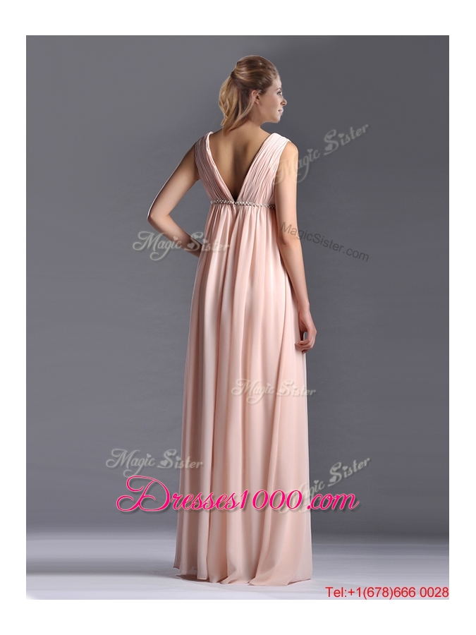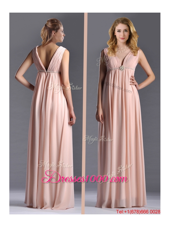 Simple Empire Chiffon Ruching Long Pink Mother of Bride Dress with V Neck
