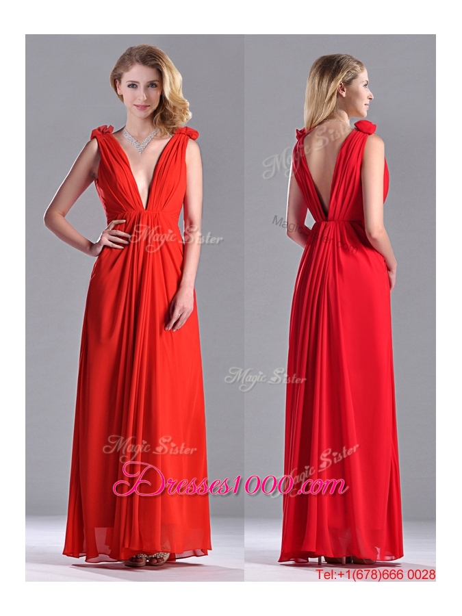 Elegant Deep V Neckline Red Dama Dress with Hand Crafted Flowers