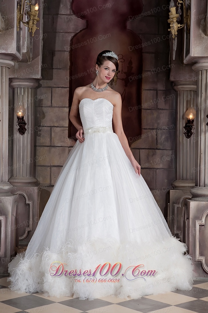 This A-line gown is everything that you've ever dreamed a wedding dress could be! The notable dress creates a touching effect which makes you the hotline. It features a symmetrical ruched bodice with a lovely sweetheart neckline. The smooth waistband accented with beading highlights the body curve. The focal point is the magnificent silhouette, great tulle fabric creates lots of fullness in the design. The multi-ruffled hem with soft feathers is absolutely a feast for eyes. The dress sways beautifully across the floor when you move, as if you're floating on air. A lace up corset style closure in the back secures the dress in place.