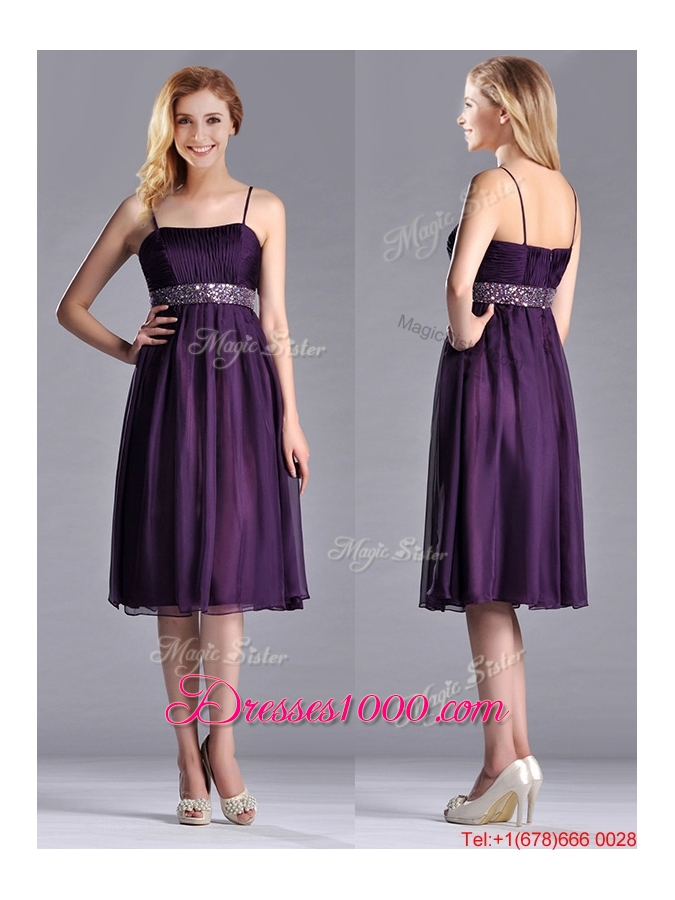Modest Spaghetti Straps Beaded Chiffon Short Dama Dress in Purple