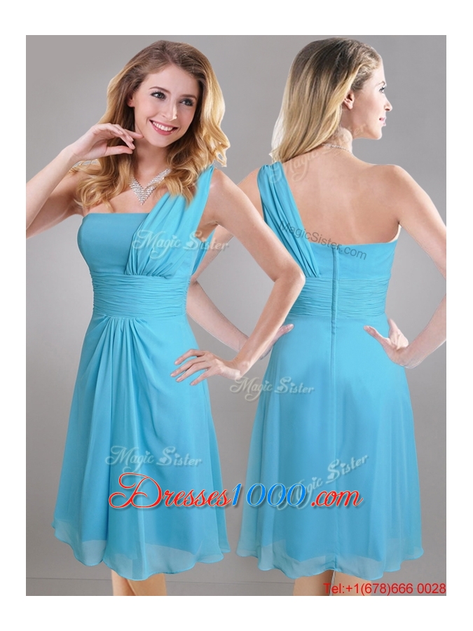 Elegant One Shoulder Ruched Chiffon Dama Dress in Aqua Blue