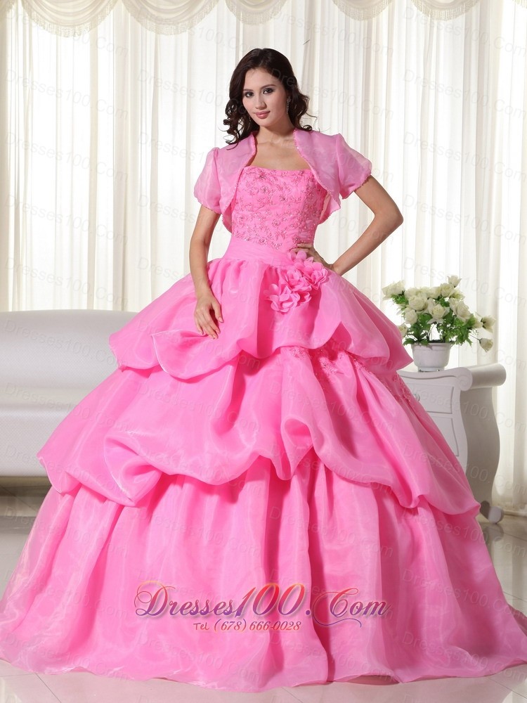Rose Pink Strapless Beading Hand Flowers Quinceanera Dress