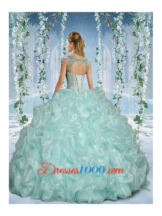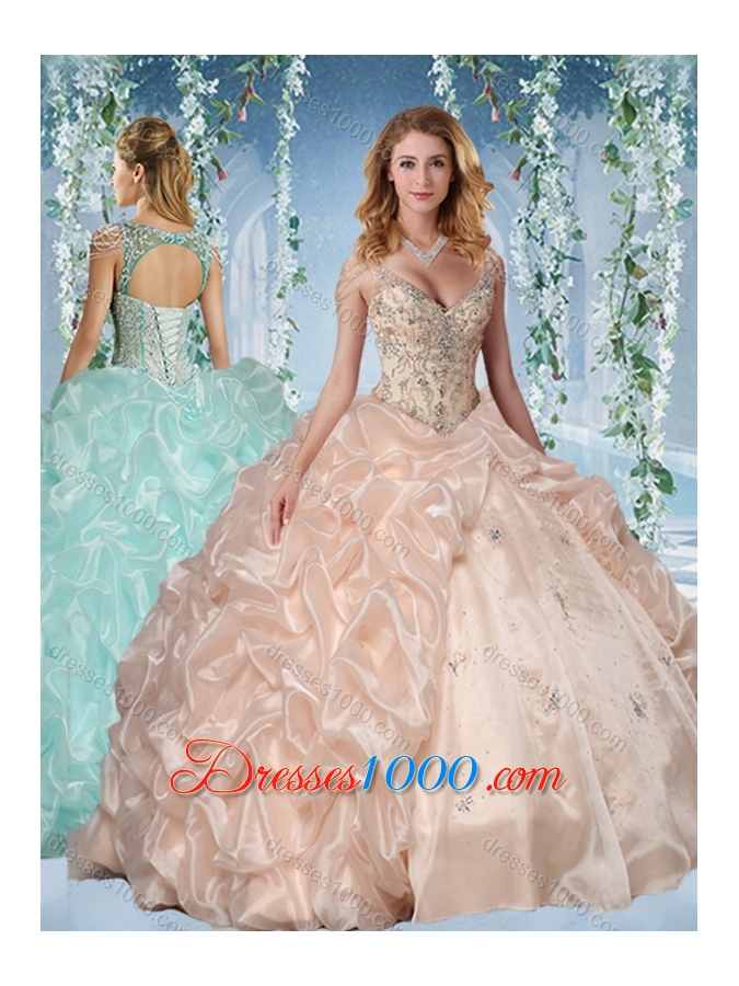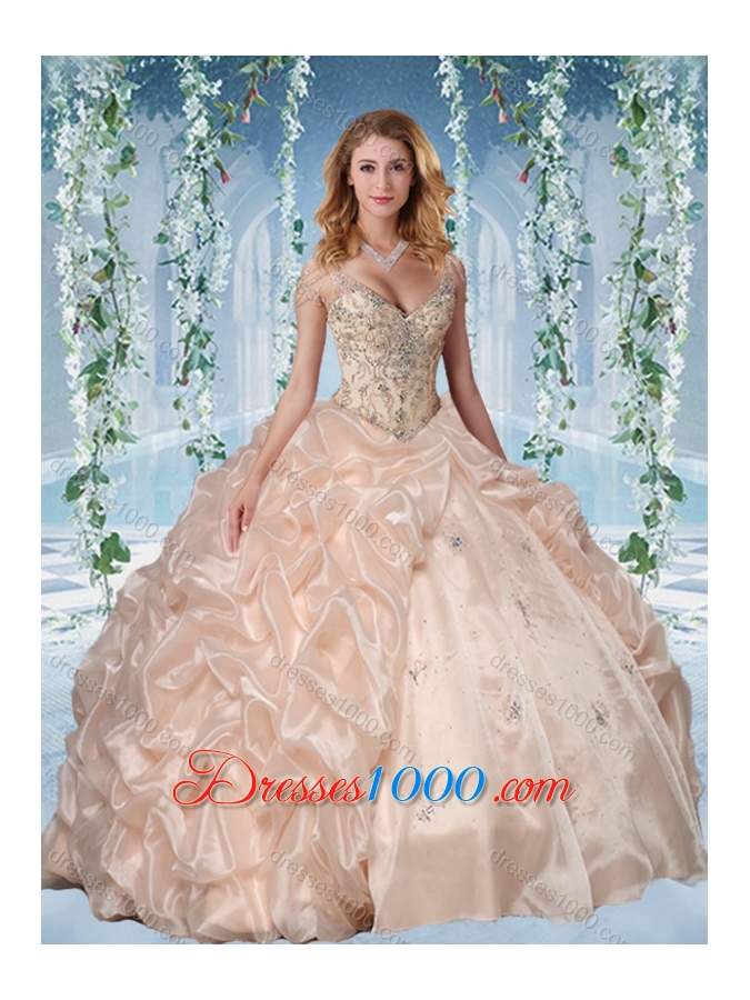 Fashionable Beaded Decorated Cap Sleeves Designer Quinceanera Dress with Deep V Neck
