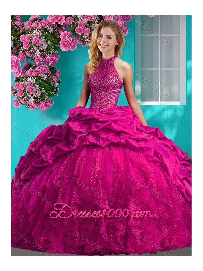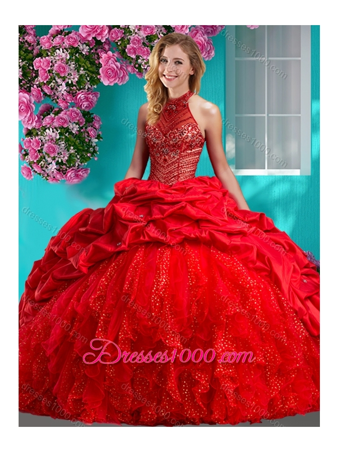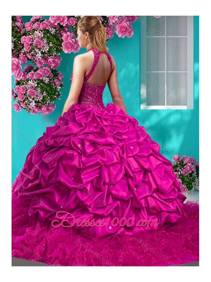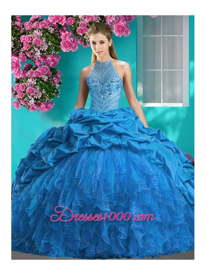 Feminine Halter Top Brush Train Quinceanera Dress with Beading and Ruffles