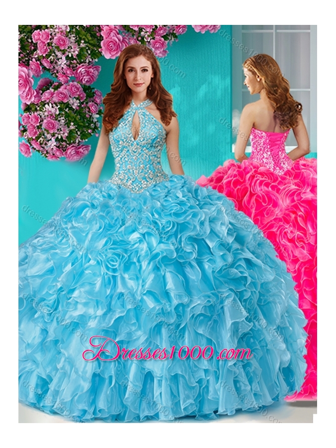 Pretty Beaded and Ruffled Big Puffy Sweet Fifteen Dresses with Halter Top