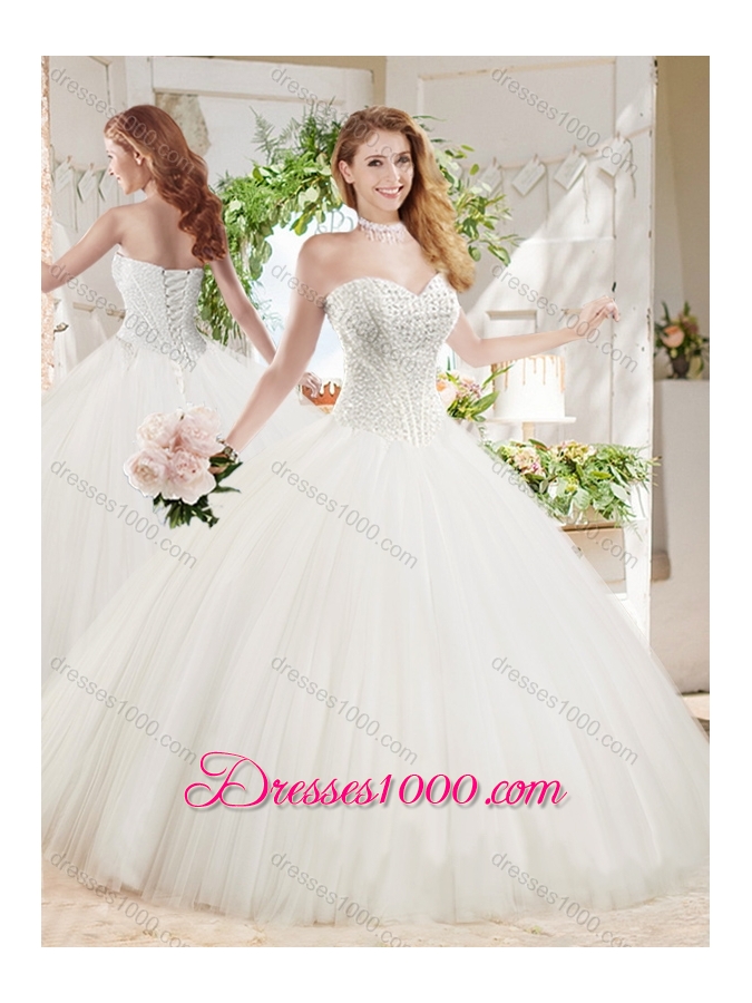 White Ball Gown Sweetheart Court Train Beaded Sweet Fifteen Dress in Tulle