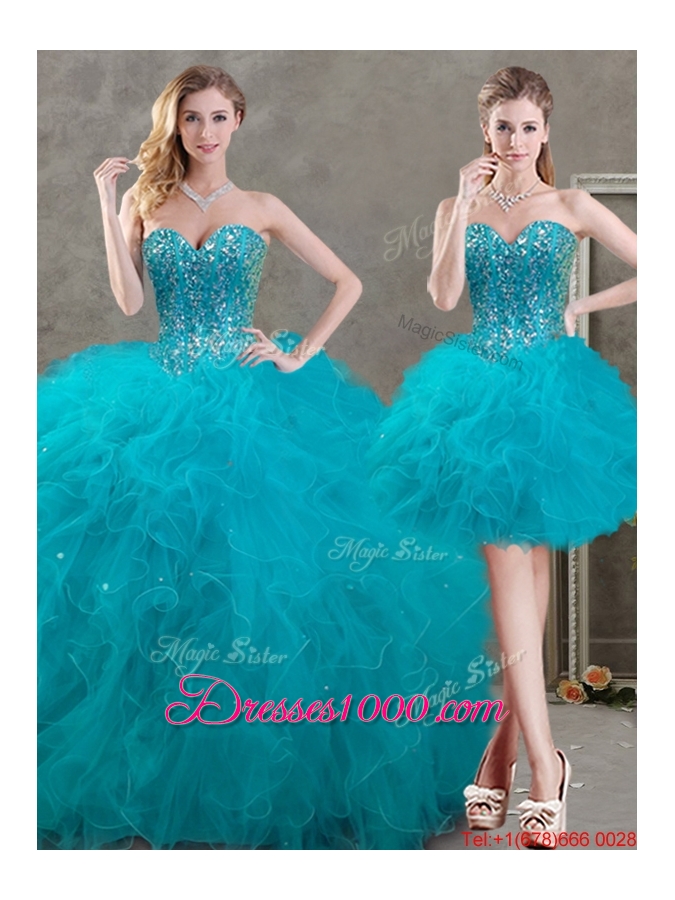 New Arrivals Beaded and Ruffled Teal Detachable Quinceanera Dresses in Organza