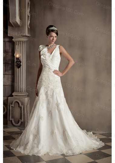 There's just something about classic gowns that no other style can duplicate. This one puts you to mind of a traditional southern belle. This fitted dress features a V-neckline which accents with hand made flowers and ruched bodice. The skirt is covered with lace which upgrades your tastes and beautifies the dress. Look like a princess in this amazing a-line wedding dress. You will be the most happy bride in the world.