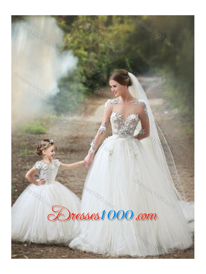 Feminine See Through Long Sleeves Perfect Wedding Dresses with Appliques and Lovely Big Puffy Flower Girl Dress with Hand Made Flowers