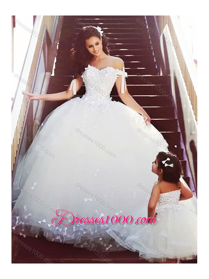 Sophisticated Off the Shoulder Perfect Wedding Dresses with Bowknot and Romantic Strapless Flower Girl Dress with Bowknot