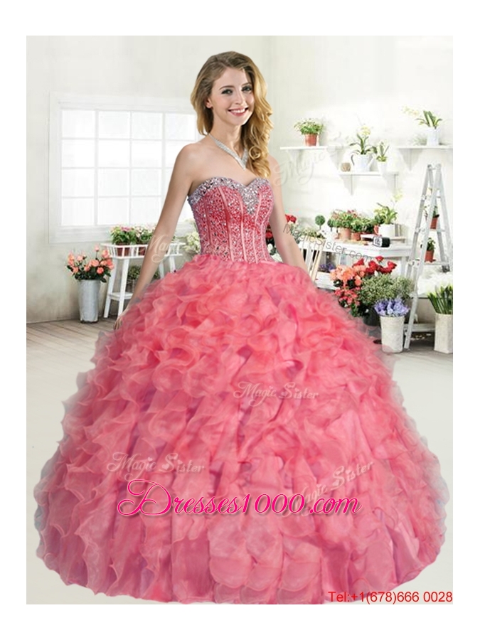 Unique Visible Boning Beaded and Ruffled Coral Red Quinceanera Dress