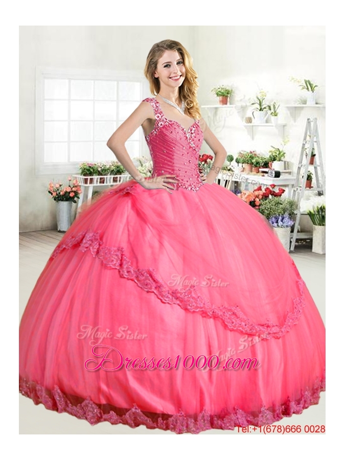 Cheap See Through Back Hot Pink Quinceanera Dress with Straps