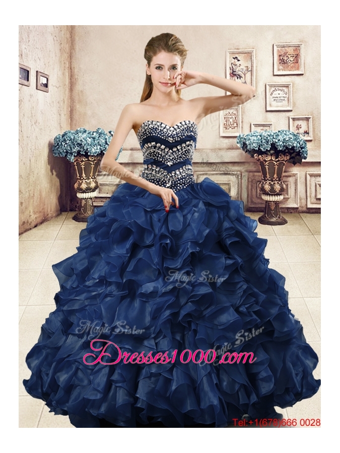 Exclusive Navy Blue Organza Quinceanera Dress with Beading and Ruffles