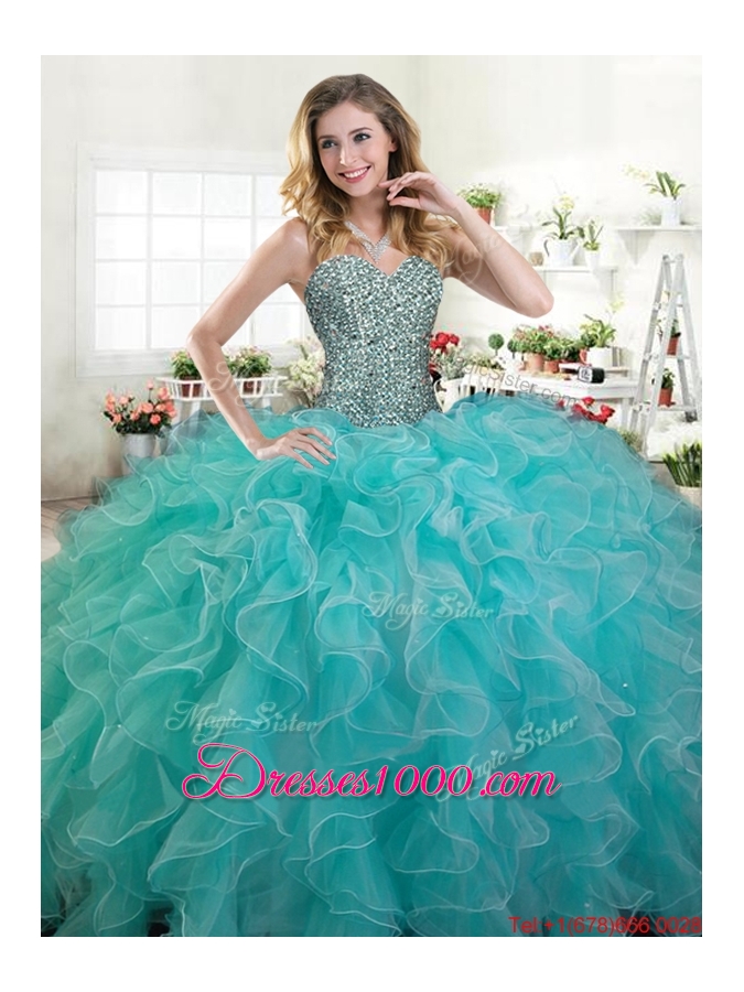 Simple Beaded and Ruffled Turquoise Quinceanera Dress in Organza