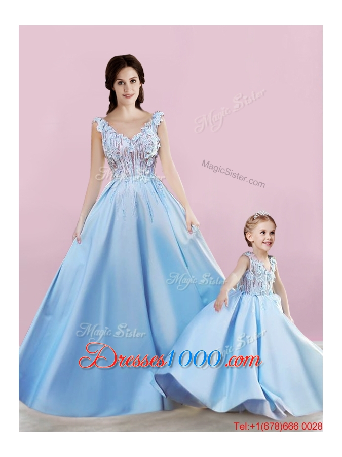 Romantic Deep V Neckline Baby Blue Evening Dress with Appliques and Best Selling V Neck Little Girl Dress in Satin