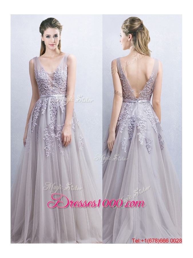 Discount V Neck Applique and Belted Backless Evening Dress in Grey