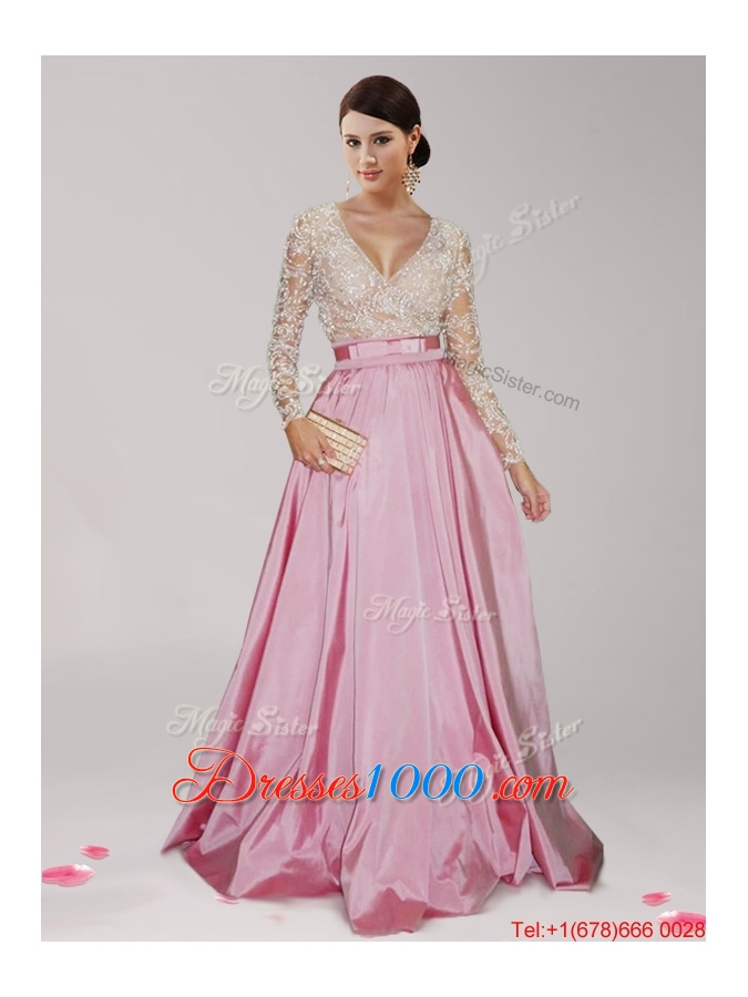 Best Deep V Neckline Long Sleeves Pink Evening Dress with Beading and Belt