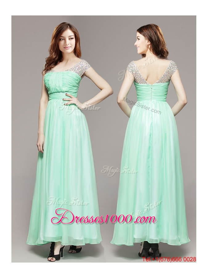 Perfect V Neck Cap Sleeves Beaded Evening Dress in Apple Green for Spring