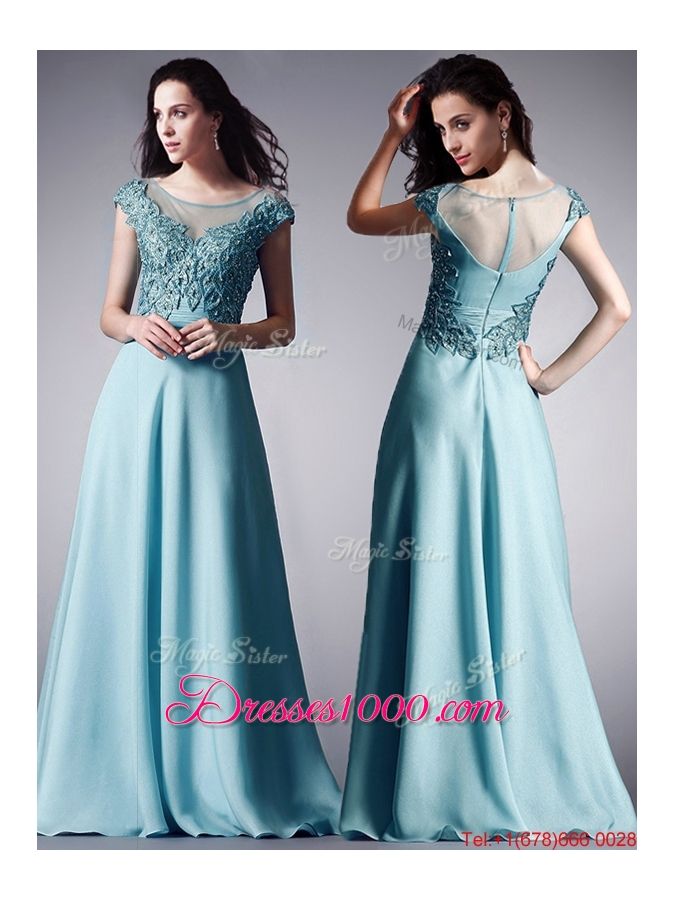 Elegant Scoop Cap Sleeves Applique Evening Dress in Light Blue