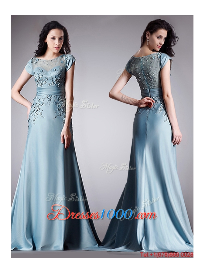 See Through Scoop Cap Sleeves Brush Train Evening Dress with Appliques