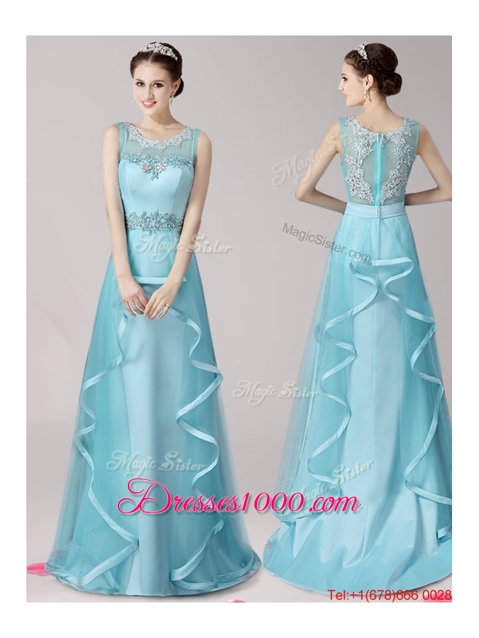 Wonderful Scoop Brush Train Light Blue Evening Dress with Appliques and Ruffles